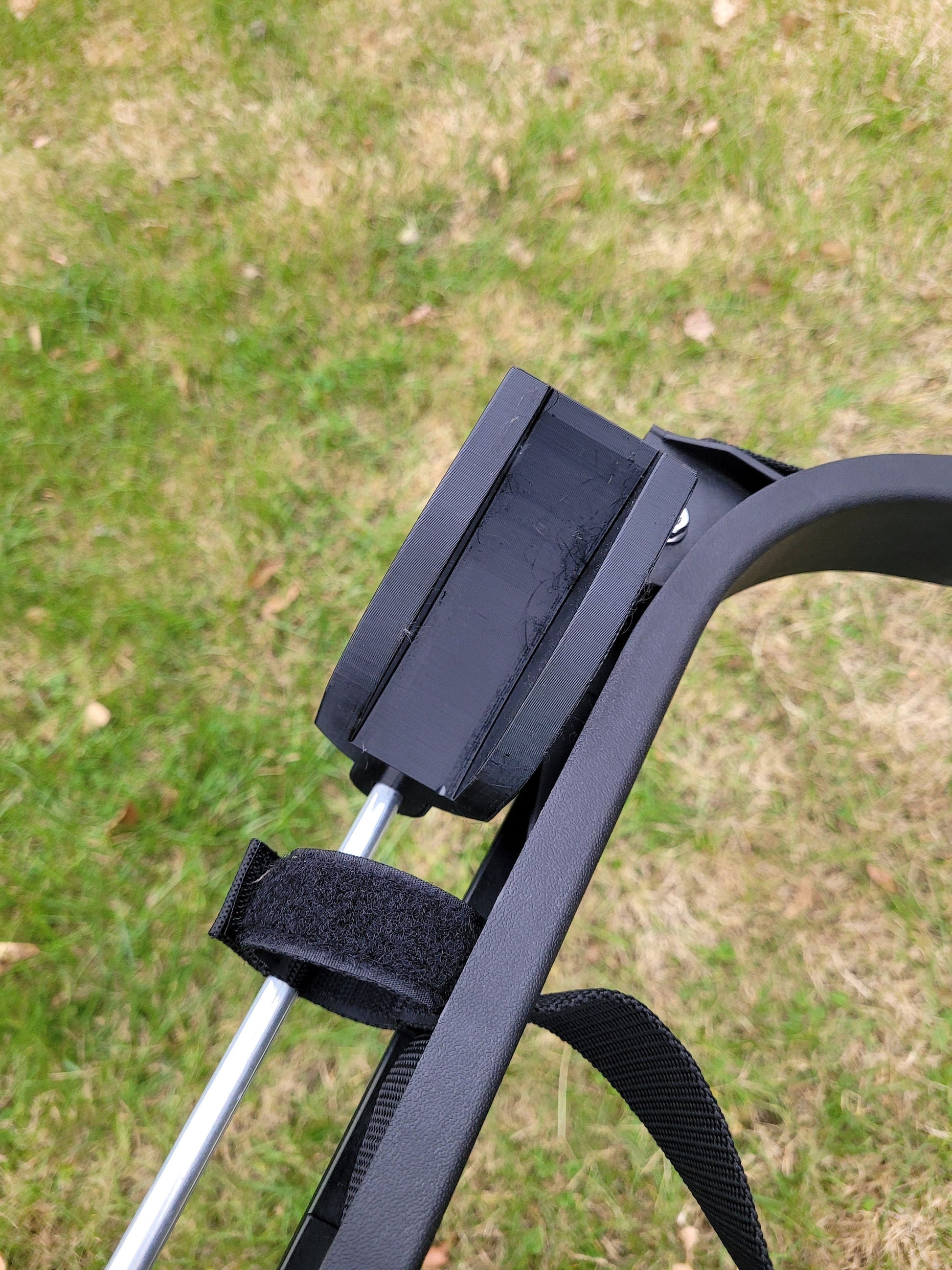 Printed out of durable PETG, it is impact resistant, UV resistant, temperature change resistant, and pretty good looking to boot. The entire assembly weighs about 4lbs! I utilize an existing tried and true EZGO strap assembly and 3D print adapters for your cart. The adapter is molded to fit snugly on your existing rear grab bar assembly. Simply push down gently, and it will slide on. To secure the golf bag holder assembly to the rear safety grab bar, wrap the velcro strap around the bar, and the aluminum rod that connects the adapters will apply ample force downward to keep your bag holder and golf bags secure.