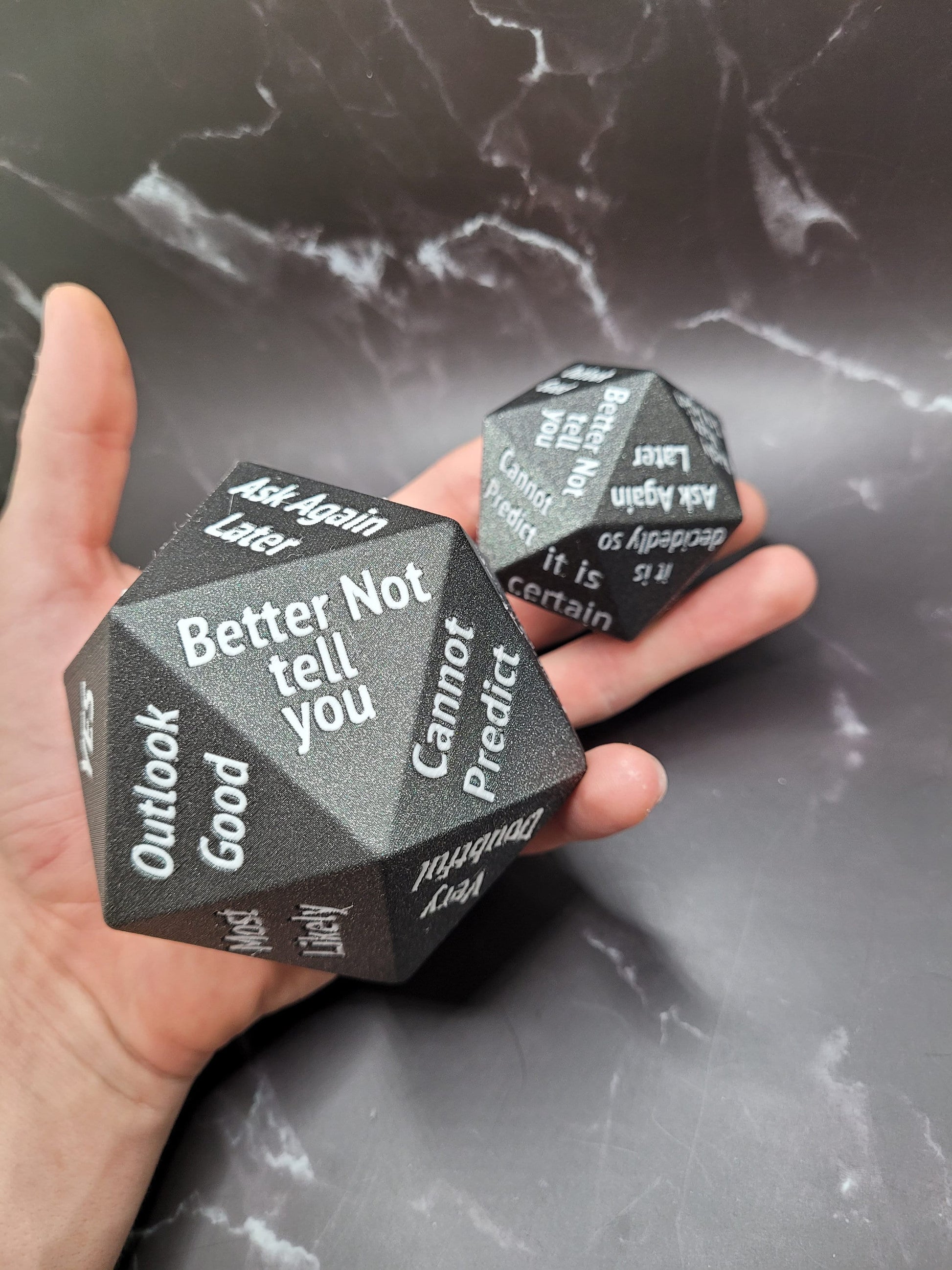 For serious - this is an oversized eco-friendly PLA plastic 3D printed two-tone D20 with as true to the original Magic eight ball phrases as you can get. Pick your die and your phrases colors and order yourself one. I now offer a super sized one! (its pretty big) You know you want to. Keep it on your desk. Keep it in your purse. Keep it in your car (but probably don't, it might get too hot in there and get too soft).