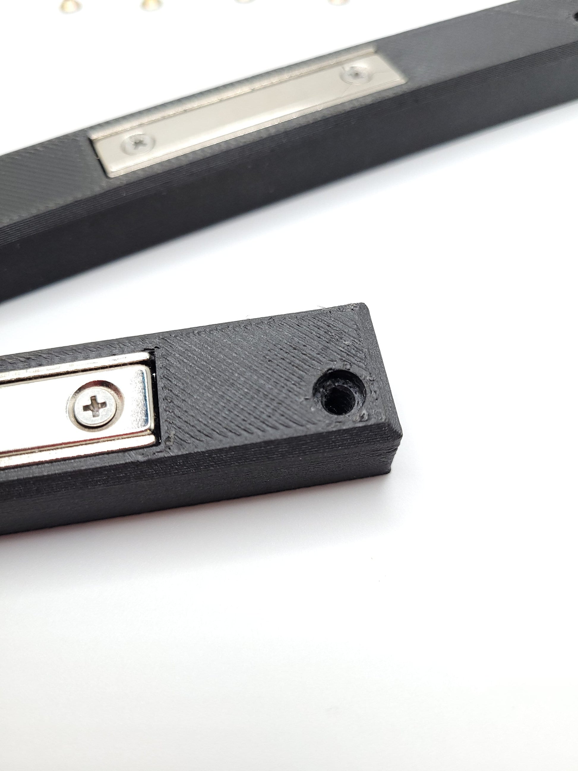 These bars are 3D Printed with carbon fiber infused PETG completely solid so they're just as tough as the charger itself. I don't have a lb/ft measurement, but on a sturdy flat piece of metal, like the side of your work bench or tool chest, this really does stick on there well. It takes some force to pull it directly off the surface, and I had no problem slapping batteries in and out with it moving on me.